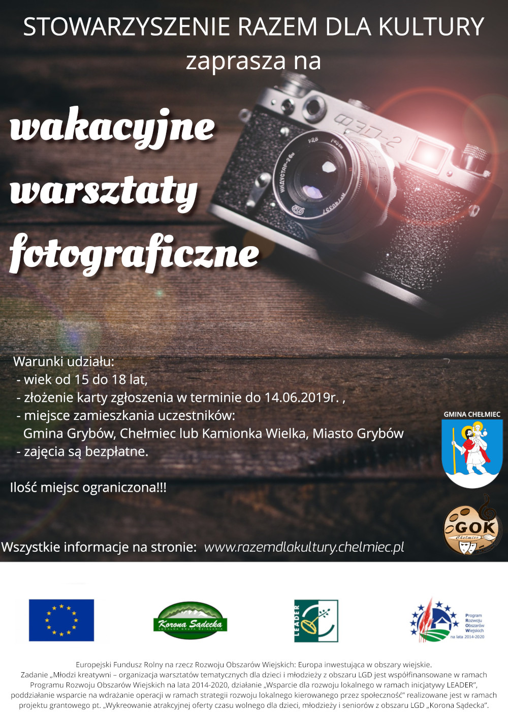 Stowarzyszenie RAZEM DLA KULTURY oraz Wójt Gminy Chełmiec zapraszają młodzież w wieku od 15 do 18 lat zamieszkującą teren LGD Korona Sądecka (gm. Chełmiec, Grybów, Kamionka) na zajęcia z fotografii. Zajęcia będą się odbywać w ASTRO CENTRUM W Chełmcu. Planowany termin realizacji warsztatów to pierwsza połowa lipca. Organizator zapewnia na czas trwania zajęć sprzęt fotograficzny oraz komputerowy niezbędny do przeprowadzenia zajęć.
