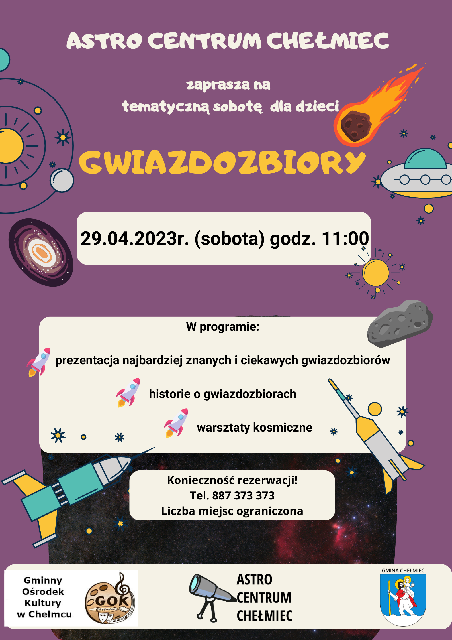 W sobotę 29.04.2023r. na godz 11:00 zapraszamy dzieci na prezentację połączoną z warsztatami, gdzie zaprezentujemy najbardziej znane i ciekawe gwiazdozbiory. W czasie spotkania opowiemy ciekawe historie związane z nimi a każdy będzie mógł zbudować swój własny gwiazdozbiór.