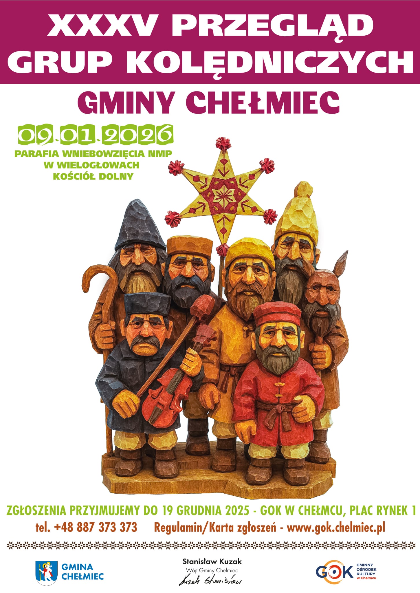 Serdecznie zapraszamy grupy kolędnicze do udziału w XXXV Przeglądzie Grup Kolędniczych Gminy Chełmiec, który odbędzie się 9 stycznia 2026 r. w Parafii Wniebowzięcia Najświętszej Maryi Panny w Wielogłowach (Kościół dolny).